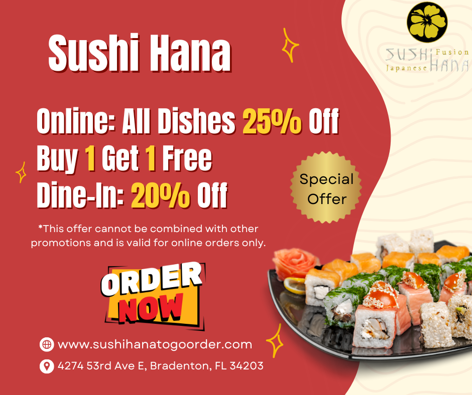 Welcome to Sushi Hana, a traditional Japanese restaurant in 4274 53rd Ave E, Bradenton, FL 34203! We serve the freshest and most authentic sushi in the city, made with love and precision by our experienced chefs. Our menu features a wide variety of sushi rolls, including nigiri, sashimi, and tempura, as well as more adventurous options like the Volcano Roll with its fiery habanero sauce and the Deep Sea Roll with its rich caviar and lemon-infused mayo. Each roll is crafted with the freshest ingredients, including super-premium fish like bluefin tuna, yellowtail, and eel, resulting in a truly sublime dining experience. We invite you to come and taste our sushi rolls. Let’s indulge in the flavors of Japan at Bradenton